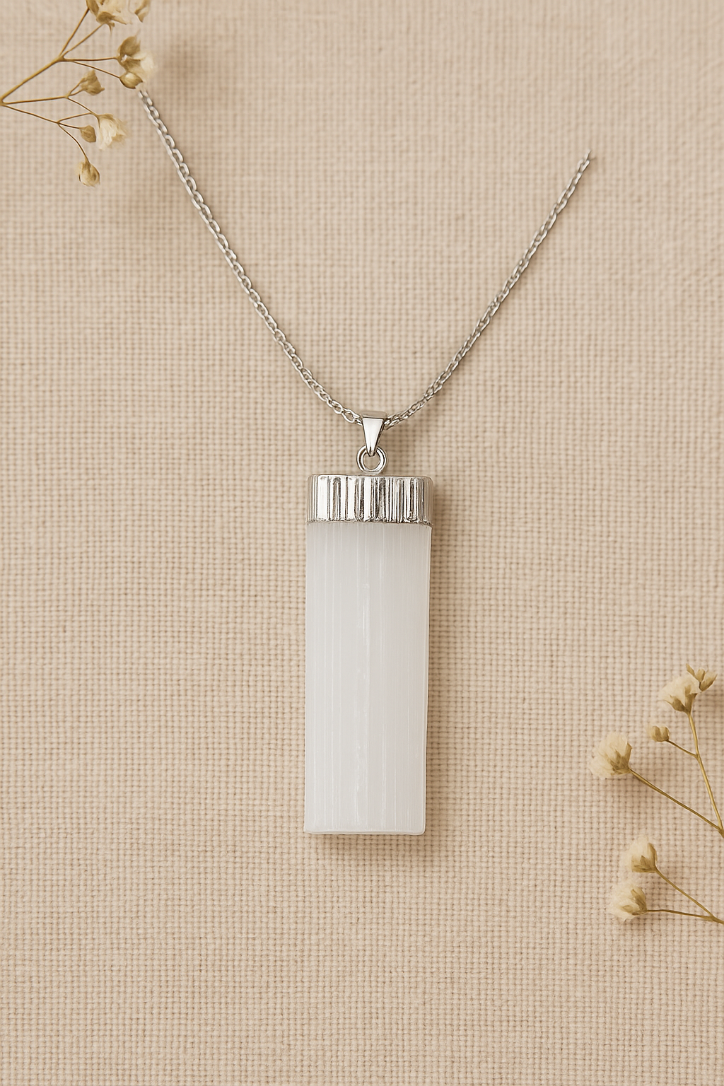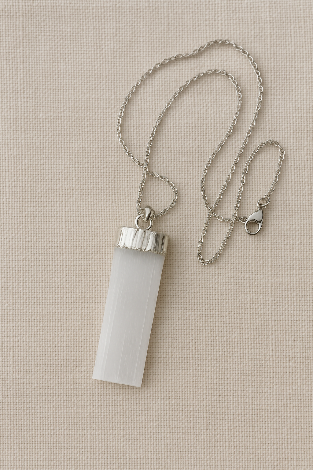 Una joya que irradia calma y pureza. La selenita es una piedra conocida por su energía limpiadora, capaz de disipar la negatividad y restaurar la armonía interior.
