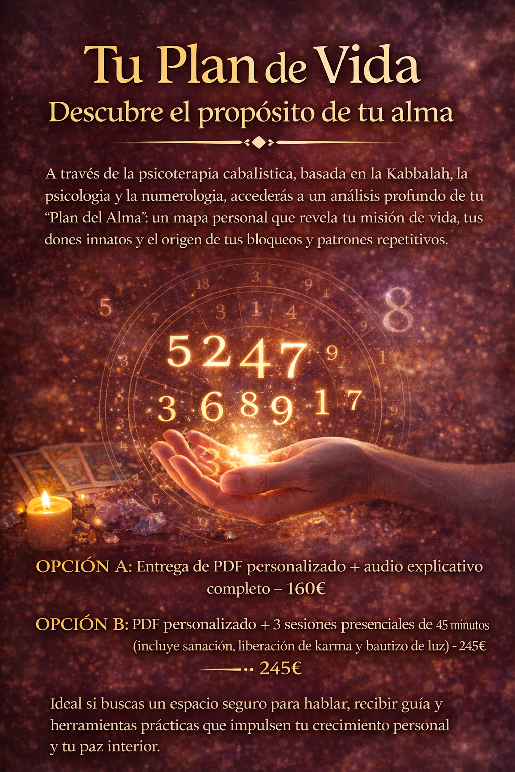 OPCIÓN B: PDF personalizado + 3 sesiones presenciales de 45 minutos (incluye sanación, liberación de karma y bautizo de luz) – 245€