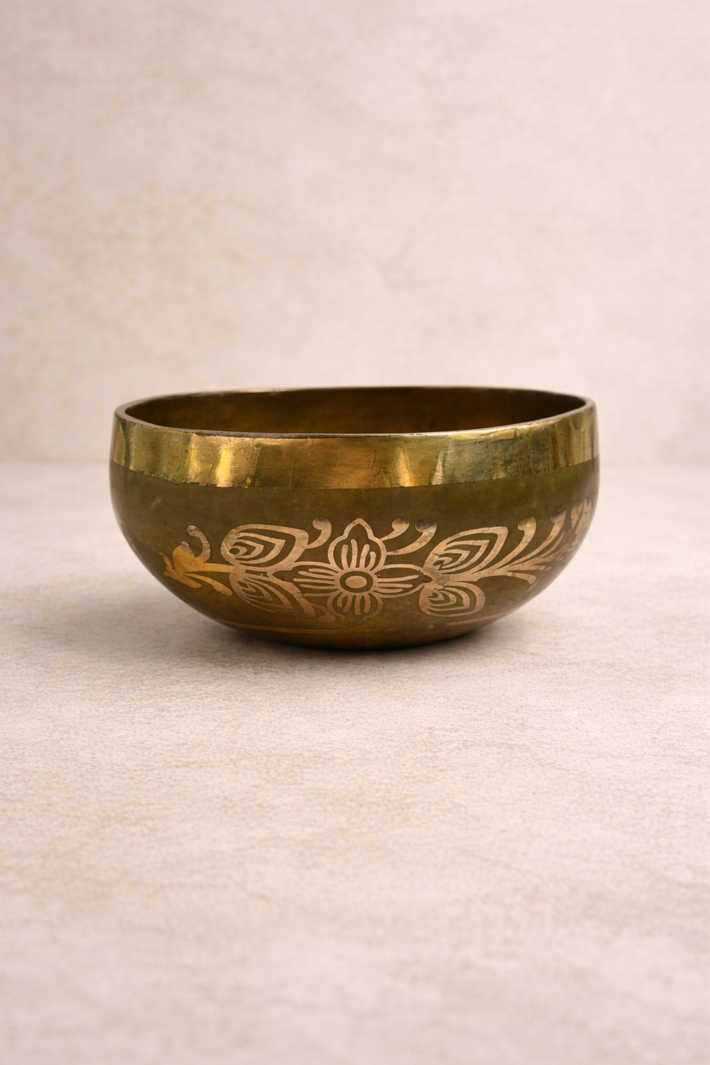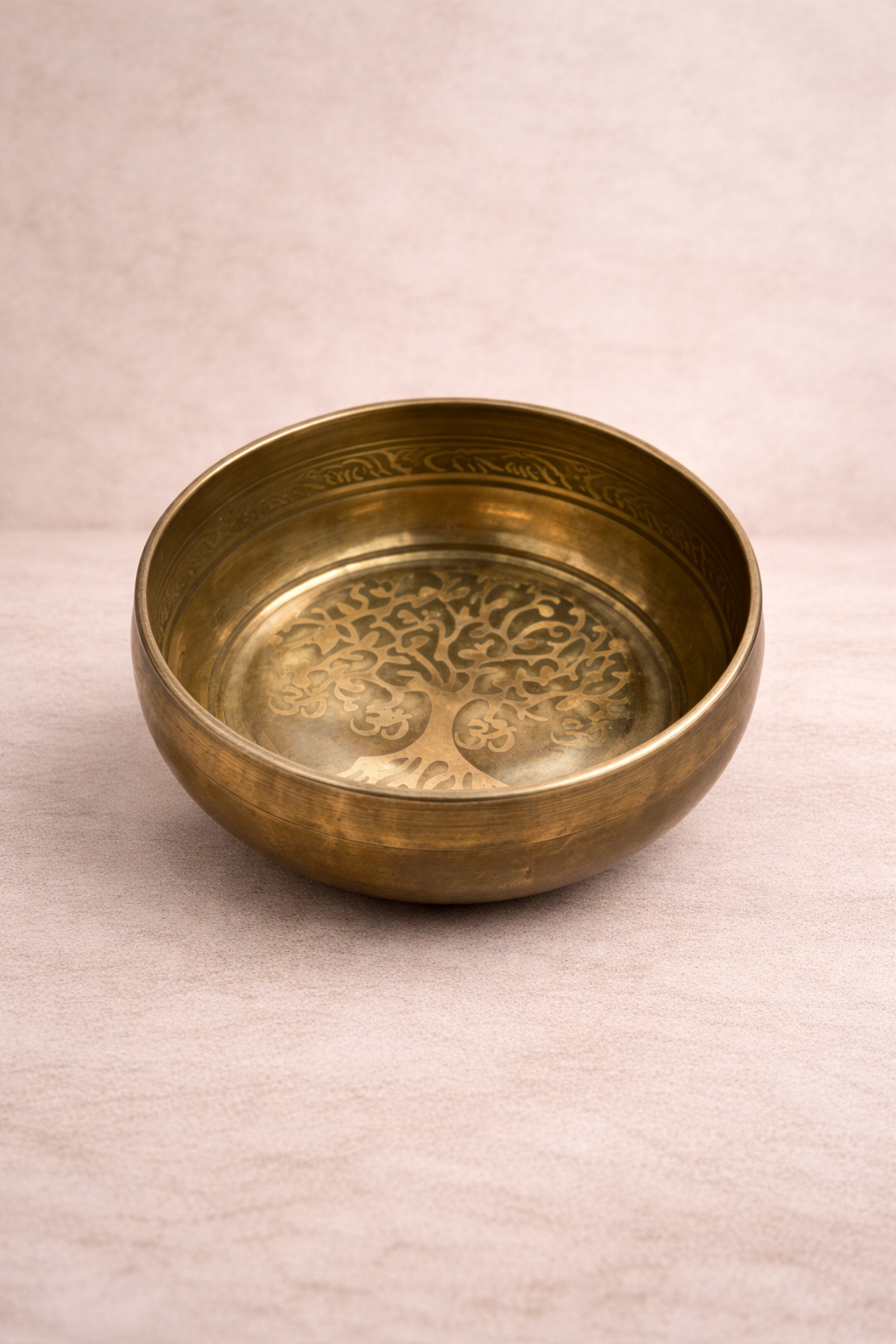 Cada cuenco es único, con delicados grabados simbólicos que potencian su valor espiritual y decorativo.