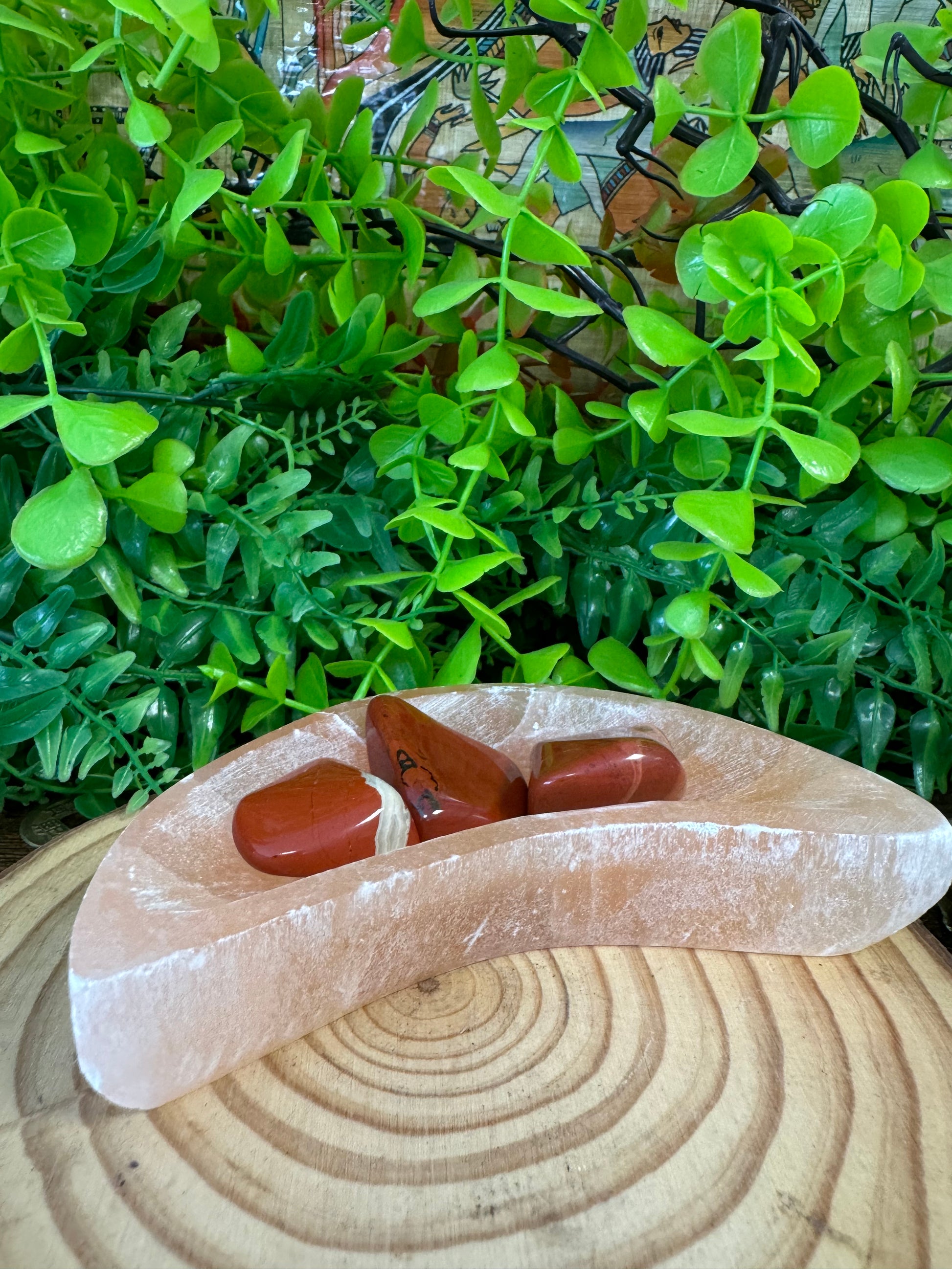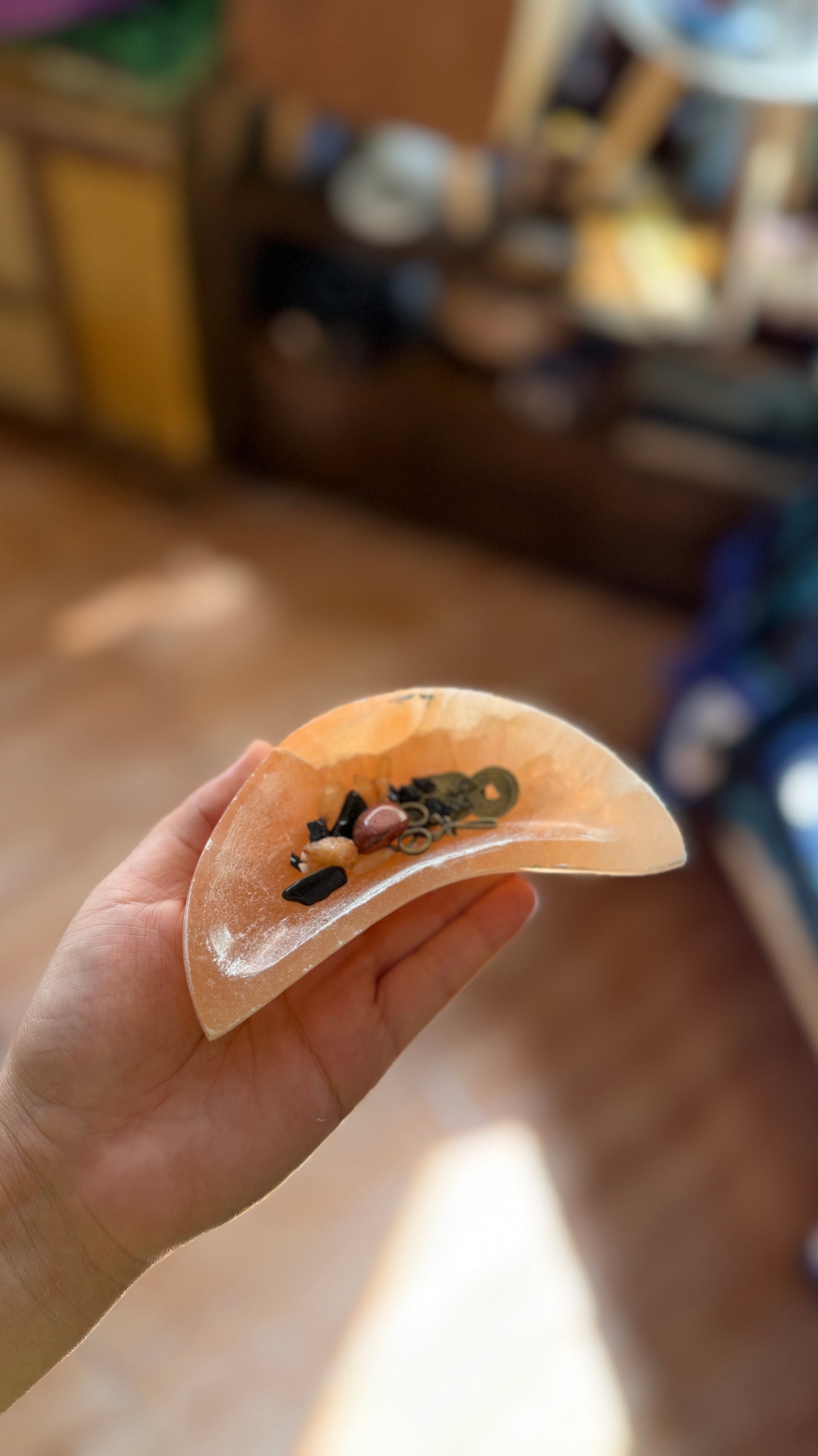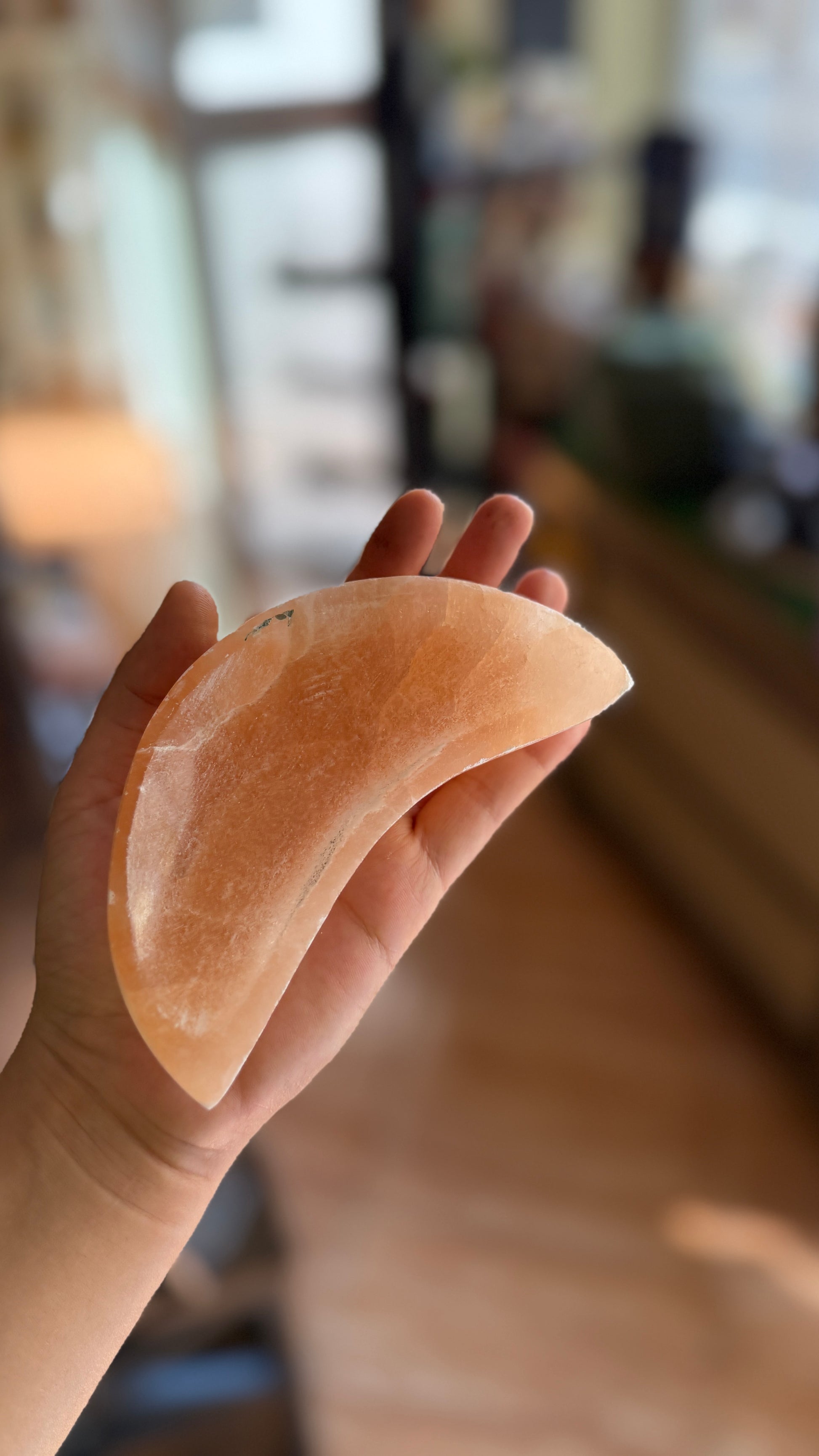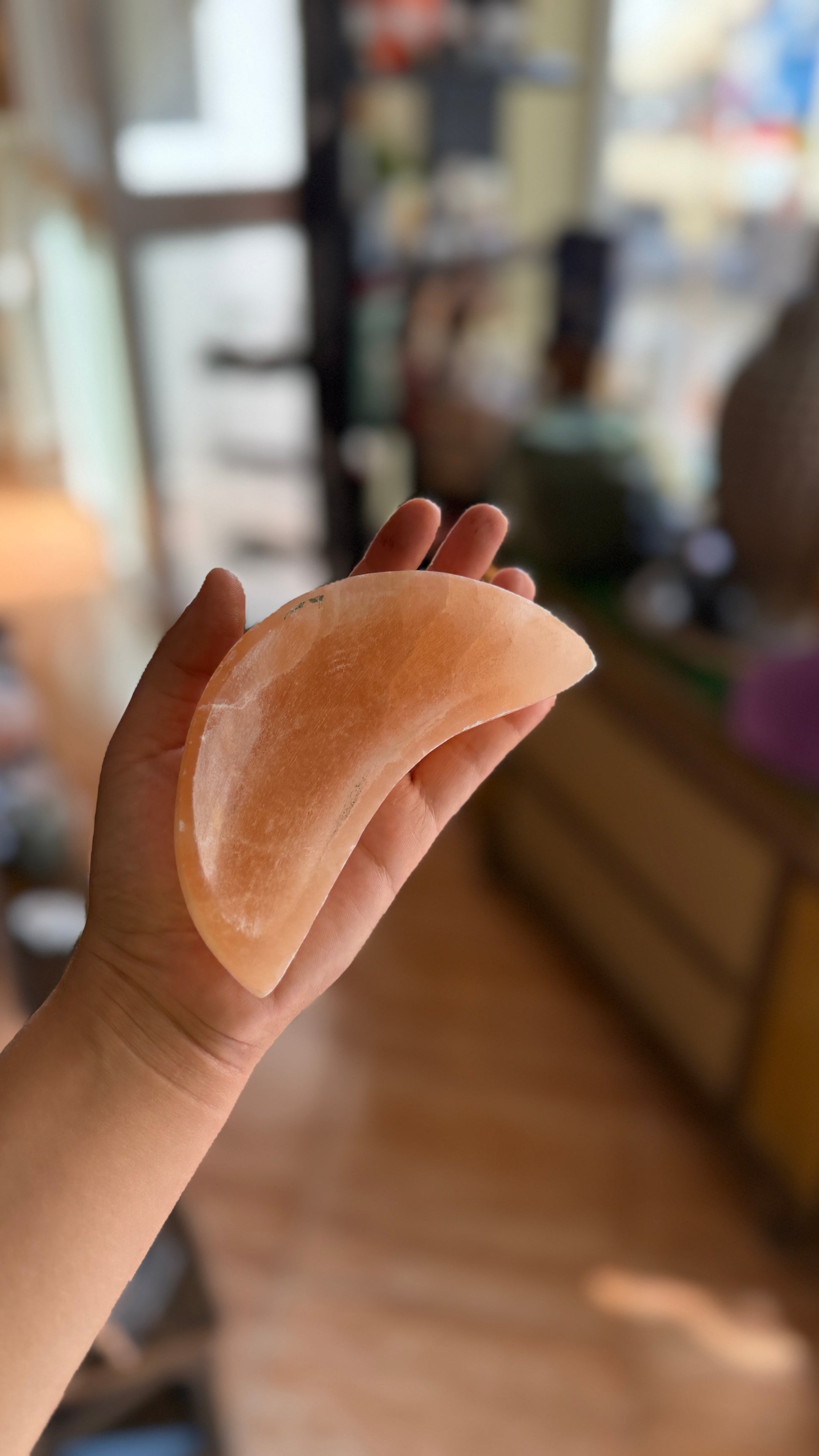 Tallada a mano en forma de media luna, esta pieza combina belleza natural y propiedades energéticas, ayudando a crear un ambiente cálido, armonioso y lleno de serenidad.