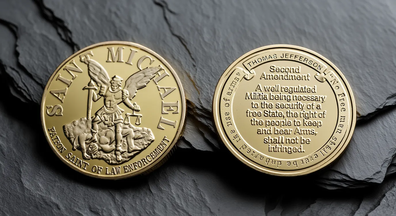 - Diseño: San Miguel Arcángel derrotando al mal en una cara, y oración protectora grabada en la otra.